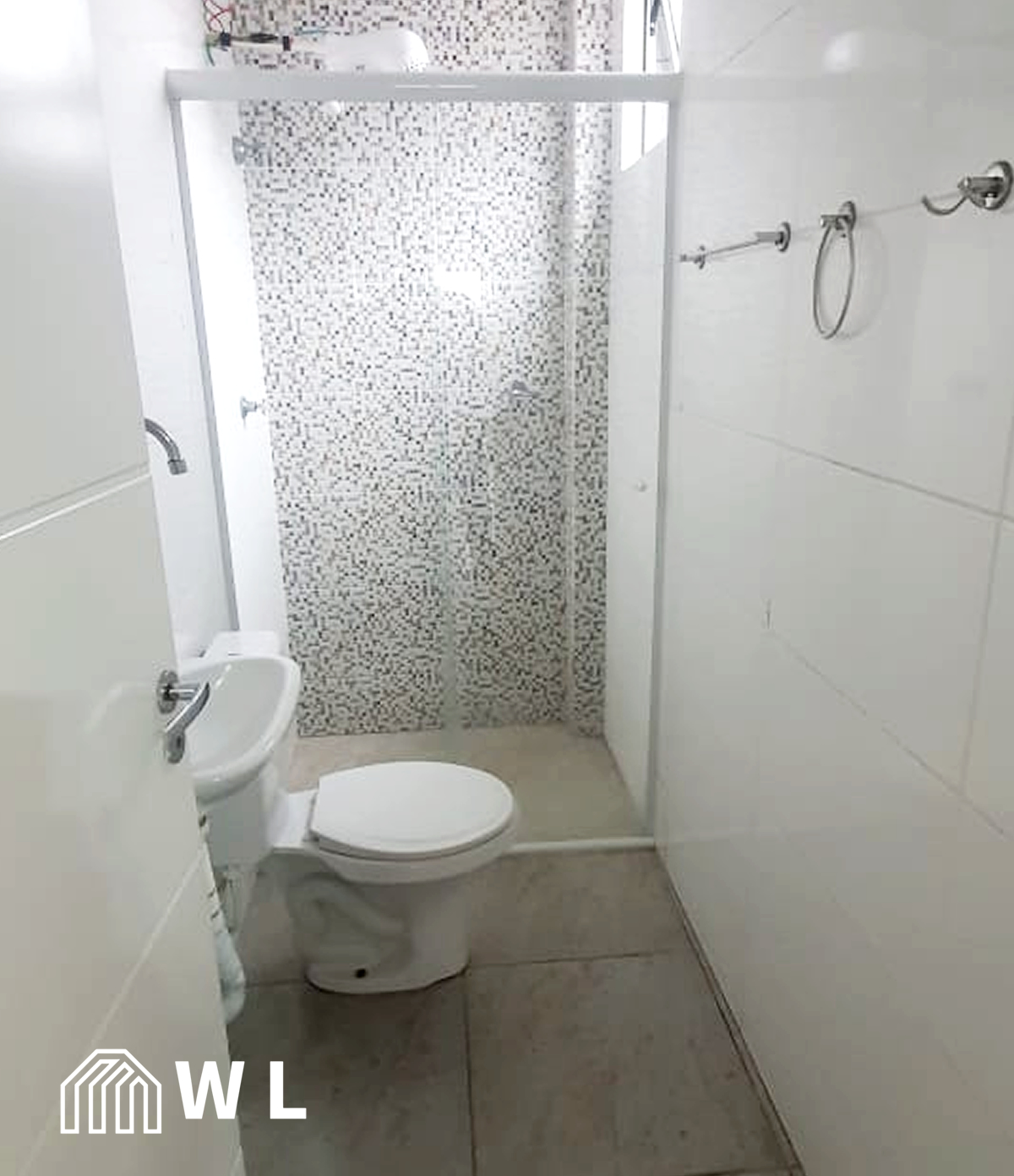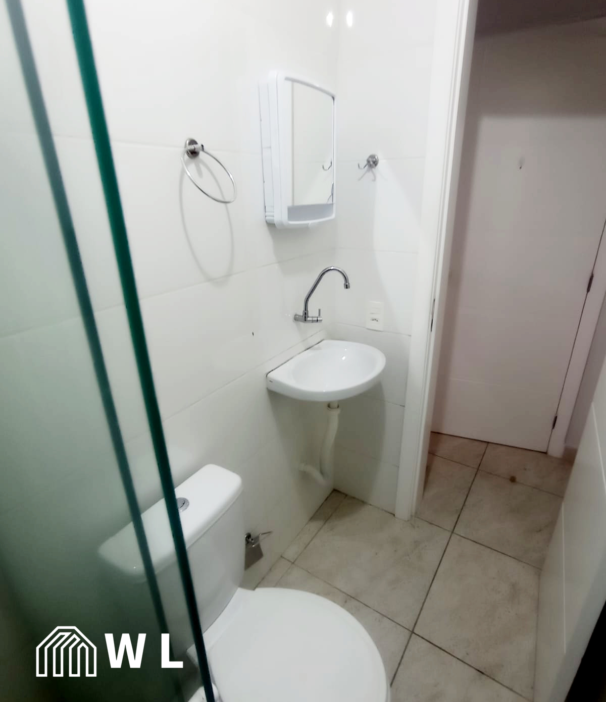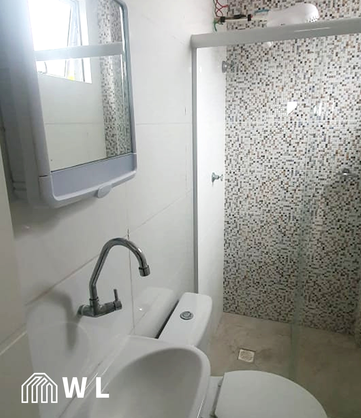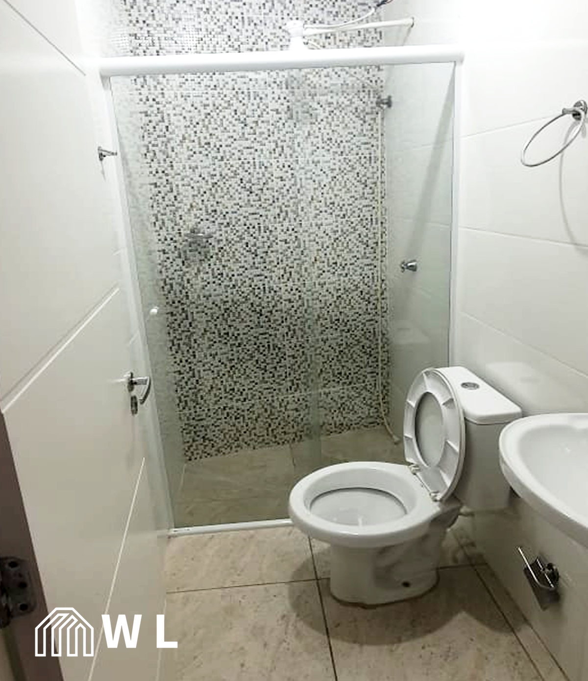 - Banheiro com box de vidro, chuveiro elétrico e armário embutido